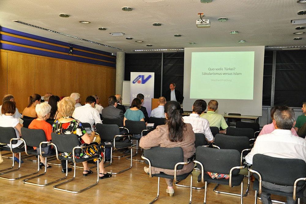 Den Beginn machte Prof. Prisching, der die religiösen, politischen und gesellschaftlichen Entwicklungen der letzten Jahrhunderte erläuterte, die mit der Entwicklung von einem Agrarstaat zu einem Industriestaat einhergingen. Ein zentrales Thema für die Türkei ist aktuell der viel diskutierte Beitritt zur Europäischen Union. Diesbezüglich ging Prof. Prisching auf die möglichen Auswirkungen eines solchen Beitritts für den Rest Europas ein.